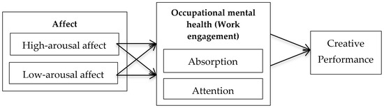 Second, we propose that work engagement, as a key indicator of employees’ occupational mental health, serves as a mechanism through which both positive and negative affect influence creative performance. Over the past two decades, the field of occupational mental health has seen significant growth, as evidenced by numerous studies, high-profile conferences, journal special issues, workshops on a wide range of topics, and the expansion of employee assistance programs provided by large corporations, hospitals, schools, and universities [22]. Traditionally, the focus of occupational mental health has been on disease and poor health outcomes. However, with the emergence of positive psychology in the early 21st century, there has been an increased emphasis on human potential and optimal functioning [23]. As a result, the focus of occupational mental health has shifted toward promoting the positive aspects of employees’ health and well-being. Occupational mental health is a multidimensional construct, encompassing a broad array of indicators such as exhaustion [24], burnout [25,26], job satisfaction/dissatisfaction [24,26,27], work stress [25], turnover intentions [26], and work engagement [24], among others. Work engagement, which is considered the opposite of workplace burnout, is one of the positive traits in this domain [28]. Defined as a cognitive motivational state characterized by vigor, dedication, and absorption [28], work engagement is viewed as a valuable psychological phenomenon due to its significance for both personal well-being and performance outcomes [29,30]. Research has shown that work engagement positively impacts employees’ health, well-being, and performance [31,32,33]. Furthermore, substantial empirical evidence and theoretical consensus suggest a strong relationship between affect and job motivation [34,35]. Positive job-related emotions, such as pleasure and excitement, are associated with high levels of work engagement [36]. In contrast, negative affect is incompatible with task focus, energy at work, or immersion in ongoing activities [37]. To examine the impact of affect on creativity, particularly the relationship between high- and low-arousal affect and creative performance, this study will measure work engagement as a primary indicator of employees’ occupational mental health in the following sections.