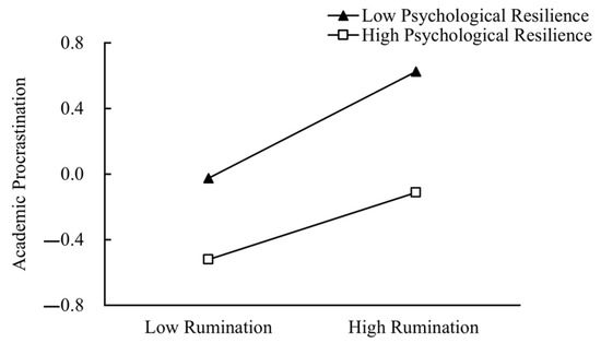 To explore the moderating role of psychological resilience between rumination and academic procrastination, Model 14 from Hayes’ PROCESS macro in SPSS was used to test the moderated mediation effect [60]. After controlling for the low-income family variable, the results are shown in Table 3. The interaction between rumination and psychological resilience significantly predicted academic procrastination (β = −0.06, p < 0.05). This finding indicates that psychological resilience significantly moderates the latter part of the mediation model between rumination and academic procrastination.