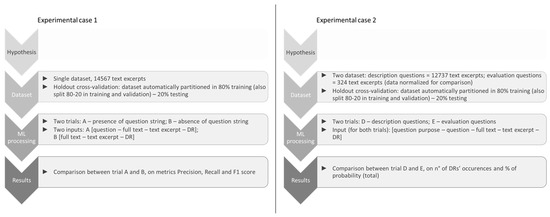 To confirm these hypotheses, we compared text denomination across ML models in two different experimental situations, where the following were provided: (1) only the text of the patients’ answers, without the question’s purpose; (2) the question’s purpose and the text of the answers. The question’s purpose was passed to the model in two steps: transmitting the entire question string, and then transmitting the information on the question type based on its purpose. The structure and processes of the two experimental cases are represented in Figure 3.