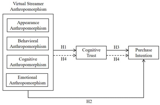 Consumers’ intrinsic and extrinsic motivations for online shopping can influence their purchase intentions through cognitive trust [31]. In addition, studies have shown that the physical attractiveness and attitude homophily of social network influencers impact their credibility, which, in turn, positively influences users’ intentions to purchase niche products [10]. Within live stream e-commerce, cognitive trust serves as a mediator between a streamer’s response strategies and audience feedback. Positive response strategies enhance cognitive trust, stimulating positive word-of-mouth, while avoidance strategies decrease trust, leading to negative feedback [25]. Cognitive trust is also a crucial mediator between streamer characteristics and impulsive buying behavior, increasing the credibility of the streamer’s information, reducing decision uncertainty, and prompting consumers to make quicker purchase decisions [33]. In virtual streamer broadcasts, anthropomorphic features make virtual streamers easier to understand and trust. Cognitive trust converts consumers’ initial impressions into trust in the streamer’s recommendations, thereby increasing purchase intention [7]. Building on the above, the study suggests the following hypotheses: