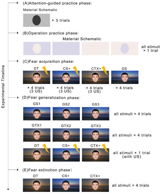 The experimental procedure was edited using E-prime 3.0. The experiment commenced with an attention-guided practice phase, followed by an operation practice phase, a fear acquisition phase, a fear generalization phase, and a fear extinction phase. Subsequent to the completion of two questionnaires, the participants proceeded to the formal experiment.