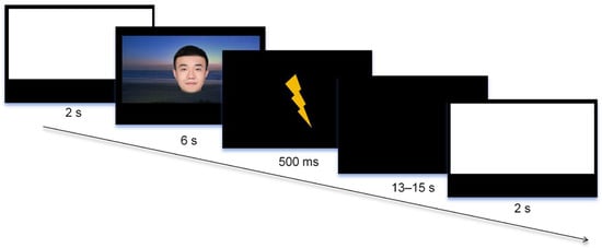 In each trial, an attention cue picture was presented for 2 s, followed by a schematic diagram for 6 s, Thereafter, there was an inter-trial interval (ITI) of a random duration between 13 s and 15 s. The participants needed to rate US expectancy while the schematic diagram was displayed. When the schematic diagram was presented, the text “What do you think is the likelihood of a subsequent electric shock?”, and a rating bar with “1” for “not at all” and “9” for “definitely” appeared below. The participants were asked to press a key from 1 to 9 on the numeric keypad within 5 s, with larger numbers indicating that the participant thought that a shock was more likely to follow after that stimulus. The same timeline was employed in each trial during the subsequent phase, as shown in Figure 2.