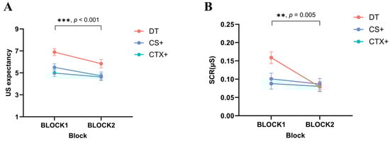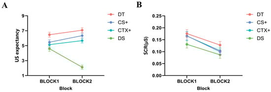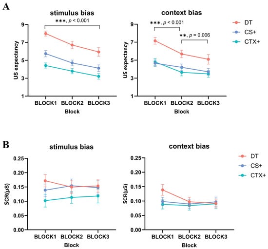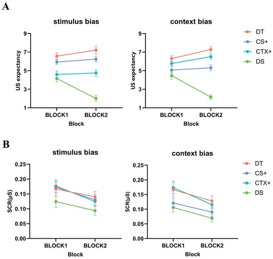 US expectancy: The results of a three-way repeated-measures ANOVA for image type (DT, CS+, CTX+) × group (stimulus bias, context bias) × block (BLOCK1, BLOCK2, BLOCK3) demonstrated a significant main effect of image type, F (2, 122) = 54.415, p < 0.001, = 0.476, and the main effect of the block was also significant, F (2, 122) = 53.631, p < 0.001, = 0.468. The results showed that US expectancy was significantly higher in BLOCK1 than in BLOCK2. In the post-hoc tests, the ratings for the DT were higher than the ratings for the CS+ (MD = 1.905, SE = 0.236, p < 0.001, 95% CI [1.433, 2.377]), and the ratings for the CS+ were significantly higher than the ratings for the CTX+ (MD = 0.636, SE = 0.245, p = 0.012, 95% CI [0.145, 1.126]). Additionally, the post-hoc tests revealed a significant difference between the ratings for the CS+ and the CTX+ in the stimulus bias group (MD = 1.058, SE = 0.352, p = 0.004, 95% CI [0.355, 1.761]). However, no significant difference was observed between the CS+ and the CTX+ in the context bias group (MD = 0.219, SE = 0.346, p = 0.530, the 95% CI [0.473, 0.911]). The interaction between block and image type was significant, F (4, 244) = 3.315, p = 0.011, = 0.052. The post-hoc tests indicated that the ratings for the CS+ were not significantly different from the ratings for the CTX+ in BLOCK1. Nevertheless, the ratings for the CS+ were significantly higher than those for the CTX+ in BLOCK2 and BLOCK3 (MD = 0.741, SE = 0.268, p = 0.007, 95% CI [0.206, 1.276]; MD = 0.575, SE = 0.242, p = 0.021, 95% CI [0.090, 1.060]) (see Figure 8A).