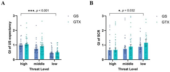 US expectancy: The results of two-way repeated-measures ANOVAs demonstrated that fear generalization occurred in the participants after fear acquisition. All main effects of image type were significant, Fs ≥ 97.105, ps ≤ 0.001. In the analysis with the GI of each generalization image, a repeated-measures ANOVA for threat level (high, middle, low) × generalization type (GS, GTX) × group (stimulus bias, context bias) revealed a significant main effect of threat level, F (2, 122) = 127.357, p < 0.001, = 0.676, with the participants having a significantly higher GI for the high-threat level than the middle-threat level (MD = 0.236, SE = 0.031, p < 0.001, 95% CI [0.174, 0.298]). Furthermore, the GI for the middle-threat level was also significantly higher than that for the low-threat level (MD = 0.444, SE = 0.045, p < 0.001, 95% CI [0.353, 0.535]). The interaction between generalization type and group was significant, F (1, 61) = 9.354, p = 0.003, = 0.133. Similarly, the interaction between threat level, generalization type, and group was significant, F (2, 122) = 3.289, p = 0.046, = 0.051. The results of the post-hoc test indicated that the participants in the context bias group exhibited a significantly higher GI for GS3 than those in the stimulus bias group (MD = 0.149, SE = 0.059, p = 0.013, 95% CI [0.032, 0.267]). Conversely, the GI of GTX1 in the stimulus bias group was significantly higher than that in the context bias group (MD = 0.287, SE = 0.113, p = 0.013, 95% CI [0.062, 0.513]). In a repeated-measures ANOVA for generalization degree (GI-GS, GI-GTX) × group (stimulus bias, context bias), the interaction between generalization type and group was significant, F (1, 61) = 9.471, p = 0.003, = 0.134. The results of the post-hoc test indicated that the stimulus bias group generalized at a significantly lower degree for the GS than the context bias group (MD = −0.631, SE = 0.315, p = 0.049, 95% CI [−1.261, −0.001]), and the context bias group generalized the GTX to a marginally significantly lower degree than the stimulus bias group (MD = −0.453, SE = 0.232, p = 0.055, 95% CI [−0.916, −0.010]). The results can be combined to reveal that individuals exhibited varying degrees of fear generalization towards the stimulus and the context under various conditions of attentional bias. For the participants who paid attention to the stimulus, the degree of generalization produced towards the GS was significantly lower than that towards the GTX, suggesting better discrimination of the stimulus. Conversely, the participants who paid attention to the context exhibited a lower degree of generalization towards the GTX, and they were better discriminators of the context (see Figure 7A).