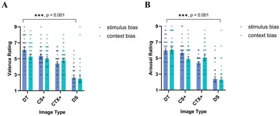 Valence ratings: A three-way repeated-measures ANOVA was conducted for image type (DT, CS+, CTX+, DS) × rating time (post-acquisition, post-extinction) × group (stimulus bias, context bias) on valence ratings. The results revealed a significant main effect of image type, F (3, 183) = 49.586, p < 0.001, = 0.448. Participants’ ratings for the DT were significantly higher than those for the CS+ (MD = 0.535, SE = 0.232, p = 0.024, 95% CI [0.072, 0.999]), and the ratings for the CS+ were significantly higher than those for the CTX+ (MD = 0.546, SE = 0.242, p = 0.027, 95% CI [0.063, 1.029]). Moreover, the ratings for the CTX+ were significantly higher than those for the DS (MD = 2.043, SE = 0.300, p < 0.001, 95% CI [1.442, 2.644]). In addition, only the stimulus bias group rated the CS+ higher than the CTX+ (MD = 0.952, SE = 0.344, p = 0.008, 95% CI [0.263, 1.640]), whereas the context bias group did not demonstrate a significant difference in ratings. A significant main effect of rating time was observed, F (1, 61) = 22.893, p < 0.001, = 0.273, with the participants providing significantly higher ratings post-acquisition than post-extinction. The interaction effect between image type and phase was significant, F (3, 183) = 2.739, p = 0.045, = 0.043. Post-hoc tests revealed that the DT, CS+, and CTX+ were rated significantly higher after the acquisition phase than post-extinction (MD = 1.073, SE = 0.388, p = 0.008, 95% CI [0.297, 1.849]; MD = 1.032, SE = 0.302, p = 0.001, 95% CI [0.428, 1.635]; MD = 1.499, SE = 0.271, p < 0.001, 95% CI [0.957, 2.040]), while DS ratings did not show a significant difference between the two phases (see Figure 9A).