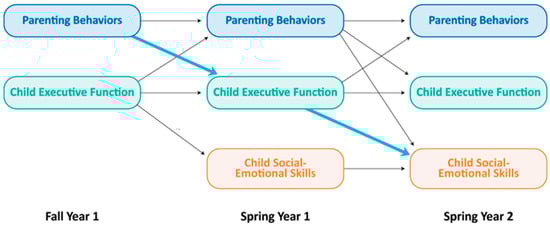 Research has shown that parenting is related to executive function [14,15] and social–emotional competence [16,17]. However, we do not know if executive function may serve as an explanatory mechanism for the relationship between parenting and social–emotional skills, that is, if executive function mediates the relationship such that parenting behaviors predict executive function, which in turn predicts social–emotional development. Additionally, we do not know if these relationships operate bidirectionally over time. Understanding these developmental processes will allow for better understanding of interventions for school readiness, long-term academic achievement, and social–emotional development for children.
