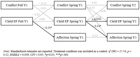 Cross-lagged panel model for conflict, executive function, and child affection towards the parent.