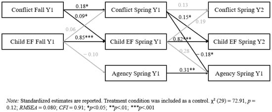 Cross-lagged panel model for conflict, executive function, and child agency.