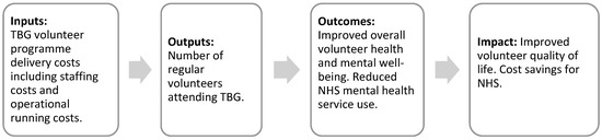 Logic models illustrate the underlying linkages between the inputs, outputs, and expected outcomes of a programme. A logic model was developed to explore how voluntary gardening inputs (i.e., the costs of facilitating and enabling volunteering) were converted into outputs (i.e., the number of volunteering hours) and subsequently into stakeholder outcomes to estimate the social value generated (Figure 1).
