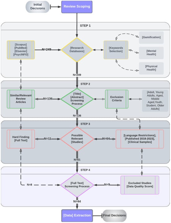 This section describes the protocol for conducting this systematic review, including all information sources, years included, eligibility requirements, and other guidelines. Only articles published in the PsycINFO database were used for this systematic review, following the PRISMA guidelines, which outline the preferred reporting items for systematic reviews []. A systematic review of the literature from the past five years was conducted, allowing us to comprehend the evolution of this field of study to the present day. Therefore, the inclusion criteria were limited to English-language articles published between 2018 and 2023 on using gamification tools to promote physical and mental health. Articles on adults, young adults, aged and middle-aged adults, youths, students, and older adults were excluded. Clinical sample-containing studies were also included in the systematic procedure. In the primary procedure, the following keywords were included: physical health, mental health, and gamification (Figure 2), along with the sub-keywords nutritional habits, physical activities, accident and security, stigma and stereotypes, internet addiction, sexual education, interpersonal relations (parameters of physical and mental health), and the key elements of gamification, motivation, learning environment, instant feedback, progress tracking, behavior change, social interaction (as is indicated in Figure 1). The final extraction after data processing was N = 44 articles following four steps: Step 1: research databases scoping; Step 2: screening process; Step 3: possible relevant studies; and Step 4: screening process (Figure 2). Based on the above procedure (PRISMA methodology) applied in the present study, all articles extracted are listed in Table below (Table 1).