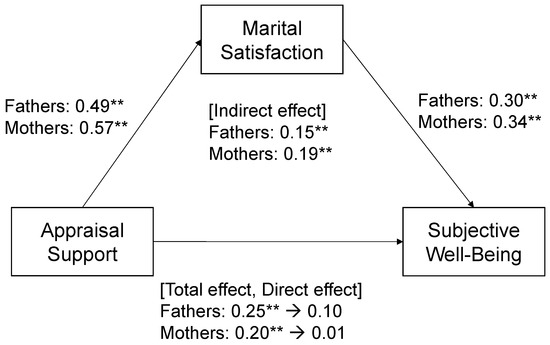 Mediation analysis was performed for fathers and mothers to explore the relationships between appraisal support and subjective well-being, mediated by marital satisfaction, adjusting for the father’s and mother’s age, number of children, age of the youngest child, children going to nursery school or kindergarten, use of childcare services, self-evaluated low economic status, and working hours on weekdays. Values indicate standardized regression coefficients. ** p < 0.01.