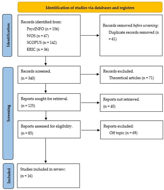 The PRISMA flow diagram [], depicted in Figure 1, was utilized for article selection. Initially, employing the list of descriptor terms from the search yielded a total of 401 articles. Subsequently, duplicate articles were removed, and the three researchers assessed 340 articles to determine their relevance to the topic of interest (i.e., addressing variables related to mental health or emotional well-being in university students with disabilities). Of these, 71 were identified as theoretical studies lacking empirical data, and 144 did not align with the subject matter. Moreover, out of the 125 articles attempted for retrieval, access to 41 articles was unsuccessful. Ultimately, following an in-depth reading of the remaining 85 articles by two authors, 68 were excluded based on exclusion criteria. Meanwhile, the remaining author supervised their colleagues’ work to ensure accuracy. In this way, the third researcher provided supervision to facilitate a consensus decision in case of disagreement regarding the relevance of an article. The data extraction table encompassed the study’s objectives, participants, study design, and key discoveries. Detailed records of decisions regarding article inclusion were maintained for comprehensive tracking purposes; for this purpose, the Parsifal tool was used, which is an online tool designed to support researchers to perform systematic literature reviews within the context of Software engineering.