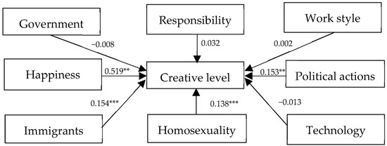 However, it must be admitted that the performance of the American sample, in some ways, verifies the core concept of the creative class at the micro level. As shown in Figure 2, the latent variables for tolerance towards immigrants/religions, gays/lesbians, technology, happiness, responsibility, work style, and political actions have significant positive effects on the level of creativity with positive standardized path coefficients of 0.062, 0.149, 0.077, 0.096, 0117, −0.097, and 0.082, respectively.