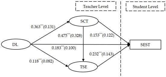Chain mediation model of DL and SEST. Note: The values outside the parentheses represent estimates, while those inside represent the effect size, denoted by f2. *** p < 0.001.
