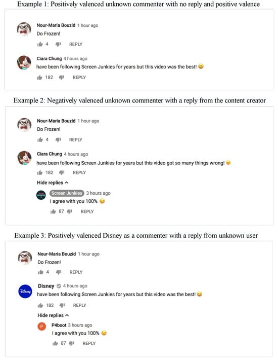 The paper mainly focuses on the movie entertainment context. Researchers specifically selected three representative YouTuber entertainment accounts for further analysis: Screen Junkies (6.66 million followers), Cinemasins (8.67 million followers), and WatchMojo.com (accessed on 31 October 2019). (21.30 million followers). In Study 1, researchers selected Screen Junkies as a prototype to create stimuli. To be consistent with Study 1, Study 2 focused on similar YouTubers, Cinemasins and WatchMojo.com (accessed on 31 October 2019). All three YouTubers are the top creators in the movies’ secondary creation discipline that attract sizable followers. We started with Screen Junkies, as they were the content creators used in our initial design, and selected two similar channels based on YouTube’s algorithm-based recommendations and Google searches conducted in March 2019. Researchers traced 32 videos that were published from 17 April 2019 to 2 May 2019. Starting from the date of video publication, we collected data from the main page for each video for 34 days, recording features such as number of views, number of likes, and number of dislikes. Additionally, the comment content was collected verbatim each day. Comments were separated into two categories: comments without replies and comments with replies. The current study defines interaction as both the comment that has a reply and the reply to the comment. The interaction was also divided into two subgroups: (1) interactor identity (creator–commenter and commenter–commenter) and (2) emotional tone (positive and negative). These examined features are described in Table 2 in more detail.