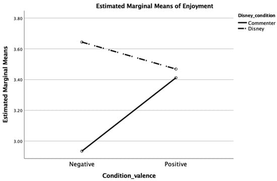 The second hypothesis predicted that positive comments would be associated with greater identification with a content creator than when an observer was exposed to negative comments. Participants who observed a positive main comment felt stronger identification with the content creator (M = 2.71 and SD = 0.89) than those who saw a negative main comment (M = 2.35 and SD = 0.88); t (242) = −3.08 and p < 0.01, which are consistent with H2. To probe for potential interactions which may have qualified this observed main effect, possible interaction effects on both identification and enjoyment were tested with univariate analyses. One additional main effect was observed. Participants exposed to Disney as the main commenter felt stronger identification (M = 2.71 and SD = 0.91) than when an unknown user was the main commenter (M = 2.44 and SD = 0.87); t (242) = −2.39 and p < 0.05. Additionally, an interaction effect between content valence and main commenter on enjoyment was observed; F (1,232) = 6.56, p < 0.05, and partial η2 = 0.03). Participants who were exposed to Disney as the main commenter enjoyed the video similarly regardless of Disney’s comment being positive or negative. However, those who were exposed to a negative comment written by an unknown user reported less enjoyment than those who were exposed to a positive comment written by an unknown user or any comment written by Disney (see Figure 2).