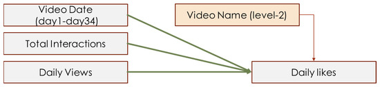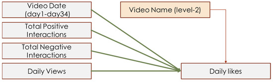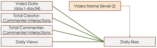 A total of 32 videos were traced for 34 days, recording behavioral observations daily. Therefore, each video similarly contributed to the total daily likes among the 34 days, but differentially contributed to daily likes among 32 videos. Overall, the current study collected 33,768 comments with no replies and analyzed 19,280 interactions (comments with replies). Among all interactions, we have analyzed 1009 creator–commenter interactions, 18,271 commenter–commenter interactions, and analyzed 4522 negative interactions and 5956 positive interactions. Therefore, a multi-level linear regression model (MLM) was used to analyze this data. The current study treated all IVs and control variables as level 1 variables, then specified a dummy variable of video name as the level 2 variable. Different video names had different intercepts of regression, which referred to the video content’s influence on daily likes. Hypothesis models are depicted in Figure 3, Figure 4 and Figure 5.