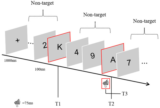 All experiments were programmed through MATLAB 2019a and Psychtoolbox 3.1.2 [22] and the data were collected using MATLAB 2019a. All visual stimuli in the experiments consisted of numbers and letters [23]. Among them, numbers between 0 and 9 constituted distractors and were presented in an alternating sequence of odd and even numbers. Odd and even numbers were alternated to avoid consecutive occurrences of the same number. Capital letters were used as the first target (T1) and the second target (T2). Confusing letters (e.g., Z and 2, O and 0, I and 1, etc.) were not included. The final letters E, G, J, K, V, R, and B were used for T1 and U, T, P, A, Z, N, and Y were used for T2. Prior to conducting the experiment, the subjects only knew that the target stimuli for T1 and T2 were letters, but not the specifics of T1 and T2 [11].