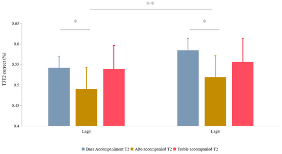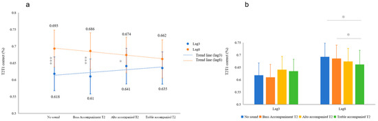 T3T2 results under different sound and lag conditions and trends. * p < 0.05; ** p < 0.01. Error bars represent the standard error.