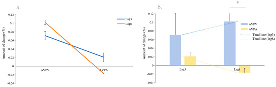 Comparison of the changes in T2 and T3. (a) Difference between AVPV and AVPA under different lag conditions. (b) Trend of AVPV vs. AVPA. * p < 0.05. Error bars represent the standard error.