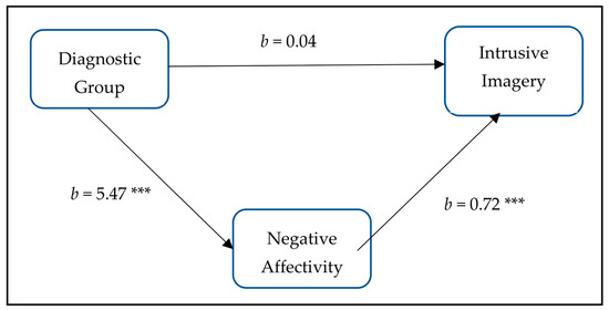 Mediation model showing the relation between diagnostic group, negative affectivity, and intrusive prospective imagery. Note: Diagnostic group = independent variable; Negative affectivity = mediator; Intrusive prospective imagery = dependent variable; *** = p < 0.001.