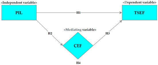 The literature on school effectiveness suggests that all three variables, namely PIL, CEF, and TSEF, significantly contribute to school effectiveness, and their interaction can promote the process of establishing effective schools [22,57,63]. On this basis, the current study suggests four specific hypotheses that are tested using a meta-analytic structural equation modeling (MASEM) approach: (H1) There is a significant positive association between PIL and TSEF; (H2) there is a significant positive association between PIL and CEF; (H3) there is a positive and significant association between TSEF and CEF; and (H4) CEF moderates the association between PIL and TSEF. The proposed model of the study is presented in Figure 1.