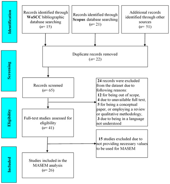 Data collection for review and meta-analytic studies is often conducted using electronic databases and following the PRISMA protocol, which includes the stages of identification, screening, eligibility, and inclusion of data sources [67]. Data search for the current study was conducted on 4 September 2023 using three major databases, namely Web of Science (WoS), Scopus, and Google Scholar, without making any time specifications. We searched these databases for novel research papers published in journals following rigorous scientific publishing procedures such as being cited or indexed in locally or internationally renowned databases. This was significant to support the rigor of the results yielded by the current meta-analytic study.