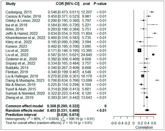 The effect sizes were interpreted using the effect size scale recommended by Lovakov and Agadullina [92] for social psychology. Accordingly, the effect sizes of 0.12, 0.24, and 0.41 were interpreted as ‘small’, ‘medium’, and ‘large’, respectively. In addition, the prediction interval [91] was calculated to determine how true effects were distributed around the overall effect size. Additionally, a heterogeneity test was conducted to determine the presence and magnitude of variance between studies. The fact that the result of this test is significant (p < 0.05) indicates the presence of heterogeneity. Its size was determined by using the I2 index. According to Higgins et al. [93], the I2 index of up to 25% indicates ‘low’ heterogeneity, while a value of up to 50% indicates ‘medium’ heterogeneity, and a value of up to 75% indicates ‘high’ heterogeneity.