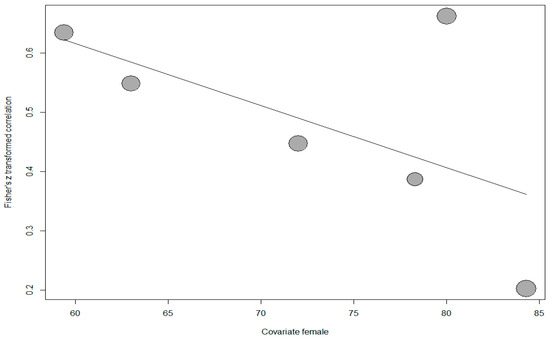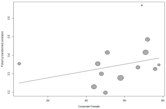 On the other hand, a meta-regression analysis was conducted to determine whether the percentage of female participants had a relationship with the effect sizes. One study was excluded from the analysis because the percentage of female participants was not reported. The scatter plot showing the distribution of effect sizes according to the percentage of female participants is shown in Figure 7.