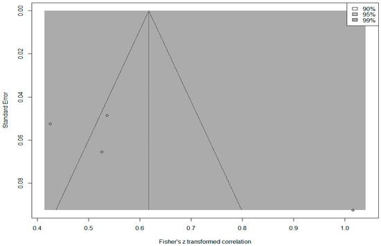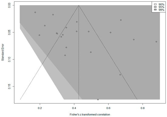 The funnel plot in Figure 5 shows that the effect sizes of all studies included in the meta-analysis are within the 99% confidence interval. The effect sizes have an asymmetric distribution around the mean and outside the boundaries of the funnel plot. Egger’s regression test and rank correlation test were performed to determine whether this asymmetry was significant. The results of Egger’s regression test (p = 0.058) and the rank correlation test (p = 0.205) showed that the asymmetry was not statistically significant (p > 0.05). Since complete symmetry was achieved in the funnel plot, a trim-and-fill analysis was performed to determine the unbiased effect size. Notably, 11 imputed studies were included in this analysis to obtain an unbiased effect size, and the expected overall effect size was calculated as 0.242 95% [0.137, 0.342]. While the observed overall effect (r = 0.403) was ‘large’, the expected overall effect (r = 0.242) decreased to a ‘medium’ level, which indicates that there may be publication bias. Therefore, it is necessary to take caution in interpreting the overall effect size.