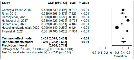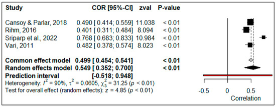 To calculate the overall effect size of the relationship between CEF and TSEF, correlation coefficients obtained from four studies (N = 1149) were used. The forest plot of the effect sizes is shown in Figure 9.