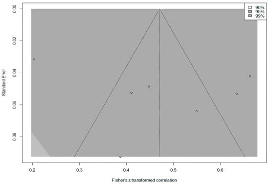 The contour funnel plot presented in Figure 10 was examined to determine whether the calculated overall effect size was the product of publication bias.
