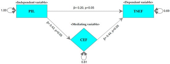Since the mediation model was saturated with 0 (zero) degrees of freedom, no fit index was calculated. The path coefficient between PIL and CEF was calculated as 0.433, 95% [0.353, 0.521]; the path coefficient between PIL and TSEF was calculated as 0.196, 95% [0.166, 0.221]; and the path coefficient between CEF and TSEF was calculated as 0.444, 95% [0.363, 0.544]. As shown in the path graph in Figure 11, PIL alone explained 19% of the variance in CEF. The direct and indirect effects of PIL on CEF explained 31% of the variance in TSEF. While the direct effect of PIL on TSEF was calculated as 0.196, 95% [0.166, 0.221], its indirect effect was determined as 0.192, 95% [0.166, 0.221]. The indirect effect was significant at the 95% confidence interval (p < 0.05), revealing that CEF was a partial mediator in the association between PIL and TSEF. The analysis of variance (ANOVA) performed to determine whether the direct and indirect effects of PIL differed significantly showed that the difference was not statistically significant (χ(1) = 0.006, p > 0.05). These results indicate that the direct and indirect effects of PIL have a similar magnitude.