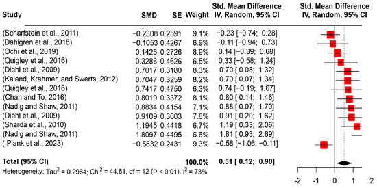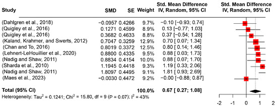 | (Scharfstein et al., 2011) [51] | 30 | 30 | M: 10.57 (Yr.) | M: 10.60 (Yr.) | Children | English | Interaction | −0.2308 (0.2591) |