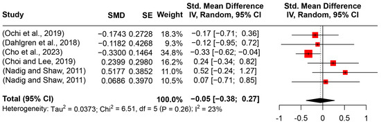 | (Ochi et al., 2019) [34] | 65 | 17 | M: 26.9 (Yr.) SD: 7.0 (Yr.) | M: 29.6 (Yr.) SD: 7.0 (Yr.) | Adult | Japanese | Interaction | −0.212 (0.2729) |