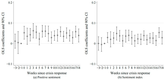 Figure 1a,b illustrate the results of the parallel trends tests with the dummy variable for positive sentiment and the sentiment index as the explained/dependent variables, respectively. The coefficients of βv are not significantly different from 0 during the second and third weeks preceding the crisis communication. This posits that prior to the onset of strategic crisis communication, there was no significant difference in the trend of public sentiment between the control group and the treatment group, hence validating the parallel trends assumption.
