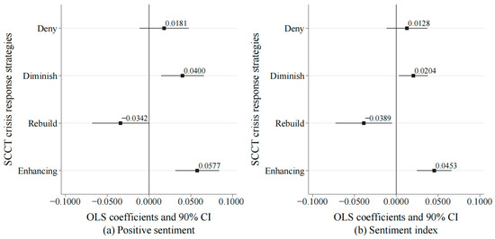 Figure 2a illustrates the regression results where the dummy variable for positive sentiment serves as the explained/dependent variable. Of the four crisis communication strategies, the enhancing strategy significantly increased positive audience comments by 5.77%. The diminish strategy also succeeded, raising positive comments by 4%. These effects were statistically significant at the 1% and 5% levels, respectively. However, videos employing deny strategies did not show a significant increase in positive comments, indicating their limited effectiveness in crisis communication. Furthermore, it is worth noting that videos employing rebuild strategies significantly reduced positive audience comments by 3.42%, demonstrating a negative impact on public perception. Figure 2b presents the regression results with the sentiment index as the explained/dependent variable. It confirmed the effectiveness of the enhancing and diminish strategies. Similarly, the deny strategies showed no significant effect, and the rebuild strategies adversely affected public perception.