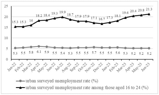 China’s recent urban surveyed unemployment rate. Source: National Bureau of Statistics, https://data.stats.gov.cn/easyquery.htm?cn=A01 (accessed on 20 October 2023).
