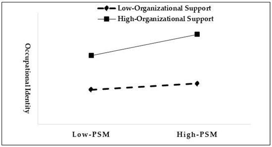Organizational support positively moderates the relationship between grid workers’ PSM and their occupational identity. Specifically, the higher the intensity of organizational support perceived by grid workers, the stronger the positive relationship between their PSM and occupational identity, and vice versa.
