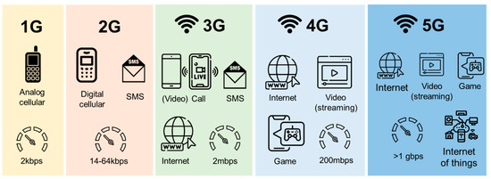 Mobile communication technology, enabling information exchange between individuals and devices, stands at the forefront of communications. It has evolved from 0G to 5G. Introducing 1G (1980–1990) and 2G (1990–2004) allowed mobile communication worldwide. Then, 3G, adopted widely from 2004 to 2010, provided greater bandwidth and global standards [24]. Since 2009, 4G has improved performance through spectrum use and multiplexing. Notably, 3G and 4G enabled mobile internet access, voice calls, and HD video calls. Since 2019, global adoption of 5G services has surged, offering superior data rates, lower latency, and broader device connectivity [25]. This advancement has unlocked possibilities like the Internet of Things and HD multimedia streaming, poised for widespread adoption across diverse fields. Figure 1 illustrates the generational evolution of mobile communication network.