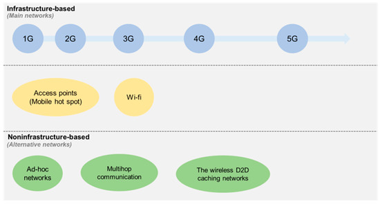 As an alternative technology, multihop communication establishes wireless networks in areas lacking traditional infrastructure [30], such as disaster-stricken regions. It offers enhanced spectral efficiency, increased transmission rates, reduced power usage, and lower communication costs [31]. However, multihop communication faces practical challenges. Intensive data exchange in specific network areas can hinder optimization [30]. Security concerns arise from unauthorized mobile users and potential traffic disruptions [32]. Privacy issues also affect multihop communication, including location and identity exposure [30]. Figure 2 illustrates the position map of wireless and mobile communication technologies.