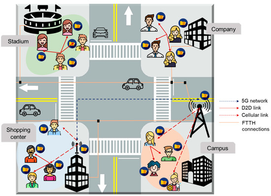 Since wireless D2D caching networks enable users to engage in direct D2D communication regardless of whether the base station is nearby as shown in Figure 3, it can minimize the overloads of a mobile network. Once a user agrees to adopt these networks, the content caching and transmission processes are automatically executed based on the mechanisms designed by the service provider, for example, a telecommunication operator. Even when the transmitter device communicating with a receiver device becomes disconnected due to distance, the continuity of watching OTT video content remains largely uninterrupted, as the receiver device can establish a direct connection with another nearby transmitter device.