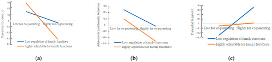 Therefore, the interaction model in Equation (1) conforms to the promotion hypothesis of “protection factor-protection factor model” rather than the exclusion hypothesis. The test in Figure 2 shows that collaborative parenting has a significant negative predictive effect on adolescents’ difficult behavior when the family function level is low (Bsimple = − 0.26, SE = 0.04, p < 0.001). When the family function level is high, collaborative parenting has a significant negative predictive effect on adolescents’ problematic behaviors (Bsimple = −0.36, SE = 0.05, p < 0.001). Therefore, the interaction model in Equation (2) conforms to the promotion hypothesis of “protective factor-protective factor model” rather than the exclusion hypothesis. The test in Figure 2 shows that when the family function level is low, adolescents’ problematic behaviors contribute to parenting burnout (Bsimple = 0.30, SE = 0.05, p < 0.001). When the level of family function is high, adolescents’ difficult behaviors have a significant positive predictive effect on parenting burnout (Bsimple = 0.03, SE = 0.05, p = 0.496), so the interaction model in Equation (3) conforms to the exclusion hypothesis of “protective factor-protective factor model” rather than the promotion hypothesis.