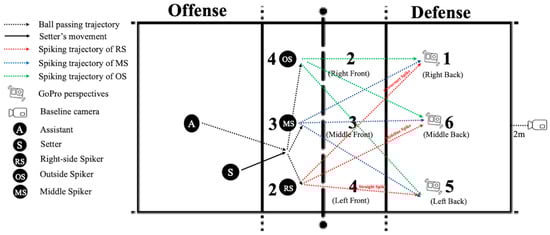 To simulate a realistic volleyball game scenario, the offensive team consisted of one setter and three spikers, positioned as the right-side spiker, middle spiker, and outside spiker in Zones 2, 3, and 4, respectively (Figure 1). Each video recording began with the assistant passing the ball, and the setter running from the backcourt to the optimal position and passing the ball to one of the three spikers. Subsequently, the corresponding spiker executed the spike. The red, blue, and green dashed lines illustrate the diverse spike trajectory options of the three spikers. For example, the right-side spiker (red line) could choose among straight, midline, and crosscourt spikes.
