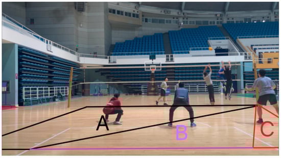 The spike anticipation tasks were divided into four sections according to shooting perspectives, with the videos recorded in each section from the same perspective. The experimental procedures for each section are illustrated in Figure 2. In each section, the participants first read the introduction to the experiment and then pressed the spacebar to begin the formal experiment. Then, a focus point (“+”) would appear for 2 s before the video stimulus material was played. The participants were required to press a key (1, 2, or 3) within 5.7 s before the freeze-frame ended to predict where the ball would land (A, B, or C, respectively, as shown in Figure 3). The areas A, B, and C corresponded to the trajectory and landing location of three different spikes from the Zone 4 spiker, including crosscourt, midline, and straight spikes, respectively. Once the participants pressed a key, they would automatically see the fixation point (“+”) to start the next video. Each section included 26 videos (Table 1). The participants could rest between sections to ensure that they remained in an optimal state for the experiment.