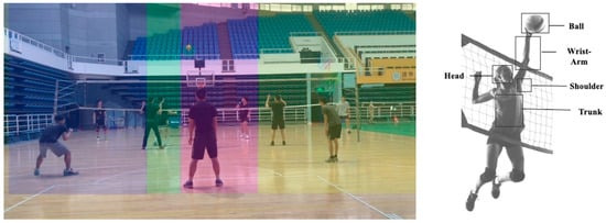 Based on a previous volleyball study [10], we divided each video into pre-spike and spiking phases for analysis (Figure 4). The pre-spike phase was defined as the period from the start of the video until the spiker contacted the ball, which lasted approximately 2.7 s. This stage had four AOIs, including the spiker in Zone 2, the setter, the spiker in Zone 3, and the spiker in Zone 4 [39,41]. The spiking phase began with the still frame and continued until the participant pressed a key. This period was used to analyze the kinematic details of the spikers on whom the participants had focused [14]. The AOIs included the ball and the spiker’s head, trunk, wrist–arm, and shoulder.