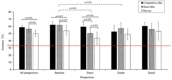 The interaction effect with factors 3 (group) × 4 (perspective) on the total fixation duration of each video was not significant (F(6,68) = 1.460, p = 0.205), and the group main effect was also not significant (F(2,35) = 1.722, p = 0.193). However, the perspective main effect was significant (F(3,33) = 11.050, p < 0.001, η2 = 0.501). Post hoc analysis indicated that the fixation duration was longer from the baseline (2512.51 ms ± 357.66 ms) than from on-court perspectives (Zone 1: 2358.31 ms ± 379.35 ms, Zone 6: 2294.81 ms ± 425.61 ms, Zone 5, 2305.99 ms ± 434.00 ms) (Table S2).