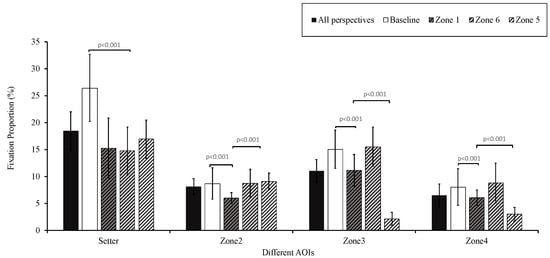 A repeated-measures ANOVA was performed with factors 3 (group) × 4 (perspective) × 4 (AOI). The interactions among the three factors (F(18,56) = 1.395, p = 0.171) and between group and AOIs were not significant (F(6,68) = 1.566, p = 0.170). However, the main effect of the AOI was significant (F(3,35) = 123.108, p < 0.001, η2 = 0.918). The fixation proportion on the setter (18.4% ± 3.6%) was significantly higher than that on other AOIs (Zone 2: 8.1% ± 1.4%; Zone 3: 11.0% ± 2.1%; Zone 4: 6.5% ± 2.1%). The interaction between perspectives and AOIs was significant (F(9,29) = 74.962, p < 0.001, η2 = 0.959). Simple effects analysis revealed significant differences among the AOIs from all four perspectives (setter, F(3,35) = 41.163, p < 0.001, η2 = 0.779, Zone 2, F(3,35) = 36.990, p < 0.001, η2 = 0.760, Zone 3, F(3,35) = 174.642, p < 0.001, η2 = 0.937, Zone 4, F(3,35) = 81.795, p < 0.001, η2 = 0.875) (Figure 7, Table S5).
