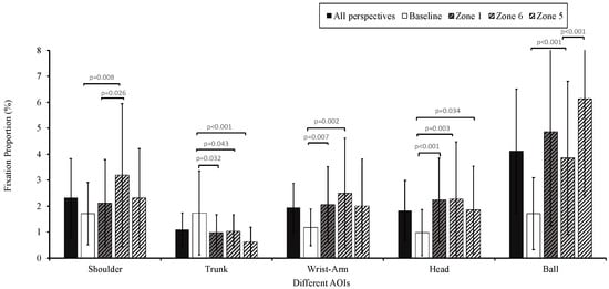 The interaction between the AOI and perspective was significant (F(12,26) = 11.024, p < 0.001, η2 = 0.836). Simple effects analysis revealed significant differences across perspectives for different AOIs, including the shoulder (F(3,35) = 4.011, p = 0.015, η2 = 0.256), trunk (F(3,35) = 8.239, p < 0.001, η2 = 0.414), wrist–arm (F(3,35) = 8.472, p < 0.001, η2 = 0.421), head (F(3,35) = 11.303, p < 0.001, η2 = 0.492), and ball (F(3,35) = 19.407, p < 0.001, η2 = 0.625). The main effect of the AOI was significant (F(4,34) = 34.573, p < 0.001, η2 = 0.803). The fixation proportion was highest for the ball (4.1% ± 2.4%) and lowest for the trunk (1.1% ± 0.6%), with similar levels for the shoulder (2.3% ± 1.5%), wrist–arm (1.9% ± 1.0%), and head (1.8% ± 1.2%). The main effect of perspective was also significant (F(3,35) = 28.879, p < 0.001, η2 = 0.712), with the baseline perspective (1.5% ± 1.2%) having significantly lower fixation compared to the on-court perspectives (Zone 1: 2.4% ± 2.0%, Zone 6: 2.6% ± 2.3%, Zone 5: 2.6% ± 2.2%) (Figure 8, Table S6).