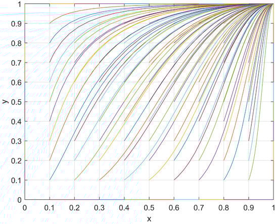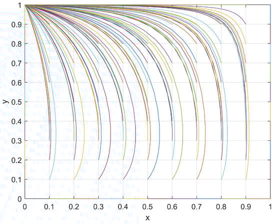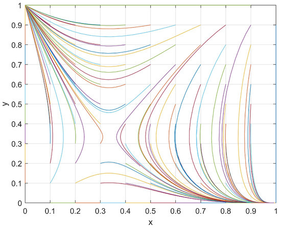 A set of values with J = 1, R = 6, M = 4, K = 2, S = 8, and N = 4 that satisfied the current conditions (M < R and N < S) were utilized. The evolutionary path of the student–club game system was plotted under different initial (x,y) values, where x and y were selected from the vector [0, 0.1, 0.2, 0.3, 0.4, 0.5, 0.6, 0.7, 0.8, 0.9, 1]. The evolutionary path was then analyzed accordingly.